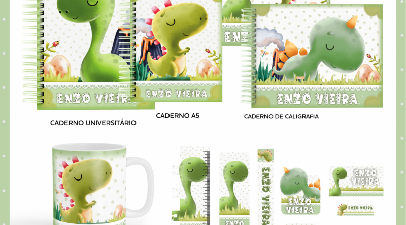 Kit Digital Combo Encadernação Escolar – Dinossauro (Agenda, cadernos, Etiquetas, Marcador de Página)