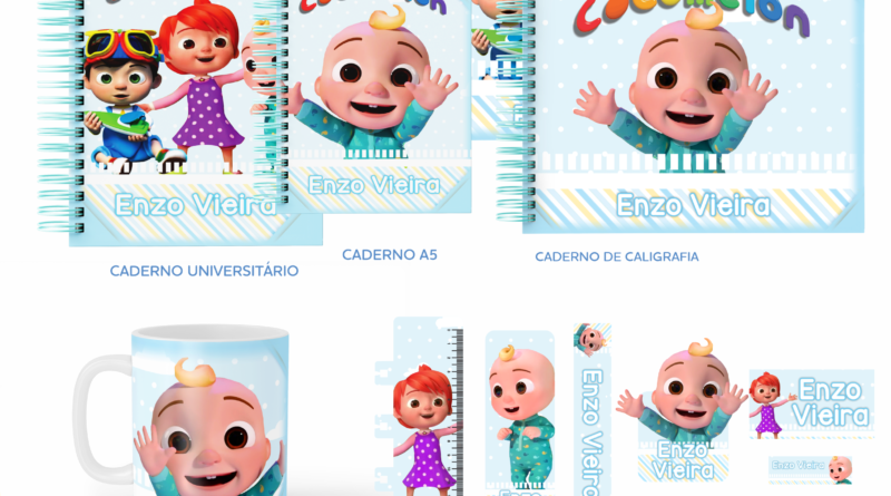 Kit Digital Volta às Aulas – Encadernação Cocomelon (Cadernos, Etiquetas, Chaveiro e Régua)