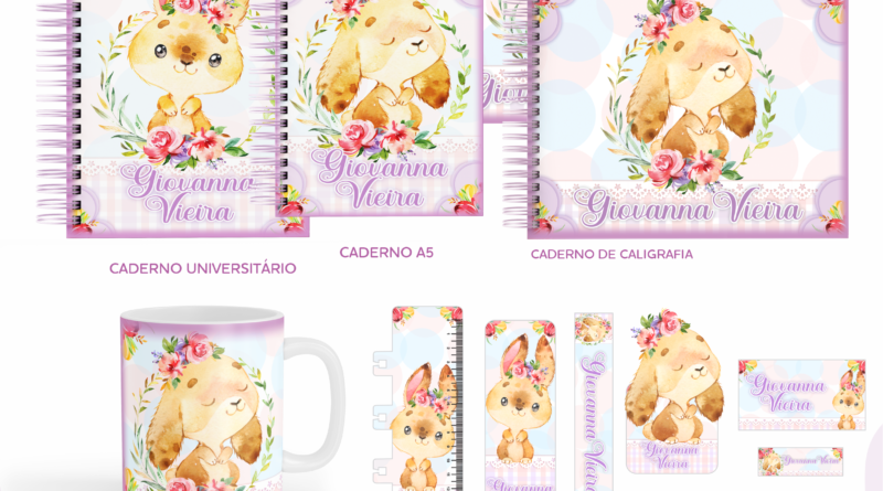 Kit Digital Volta às Aulas – Encadernação Coelhinhos (Cadernos, Etiquetas, Chaveiro e Régua)